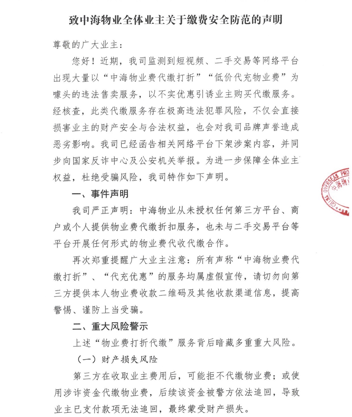 緻中(zhong)海物(wù)業全體(ti)業主(zhu)關于(yu)繳費安(an)全防範的(de)聲明